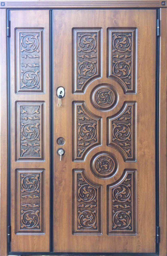Хорошие атмосферостойкие свойства корабельной фанеры позволяют использовать ее для отделки металлических дверей. Внешне корабельная фанера ничуть не уступает накладкам из массива, но, в отличии от них, более легкая, долговечная, устойчива к перепадам влажности и температуры, не рассыхается, менее подвержена деформации и не имеет так называемого «эффекта памяти», то есть, в отличии от накладок из массива, не старается «вернуться» в исходное положение. По стоимости двери из корабельной фанеры находятся в одном ценовом диапазоне с дверями, сделанными с использованием массива. Ввиду высокой плотности материала, фрезеровка выполняется специальными фрезами, что дает возможность изготовить дверь под любой интерьер и по любому эскизу. А вот вручную нанести фрезеровку на корабельную фанеру не получится – таковы особенности этого материала.